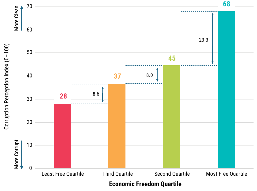 Cuando se compara el nivel de libertad económica de los países con su nivel de corrupción, los países económicamente libres parecen relativamente limpios. Y las puntuaciones de los países más libres son más del doble que las de los países menos libres (Figura 2). Esto se debe a que diversos aspectos de la libertad económica, incluida la apertura comercial, están asociados con menos corrupción. El comercio más libre hace que la reputación sea lo más importante, lo que mitiga los incentivos corruptos e inculca normas honestas en toda la sociedad.