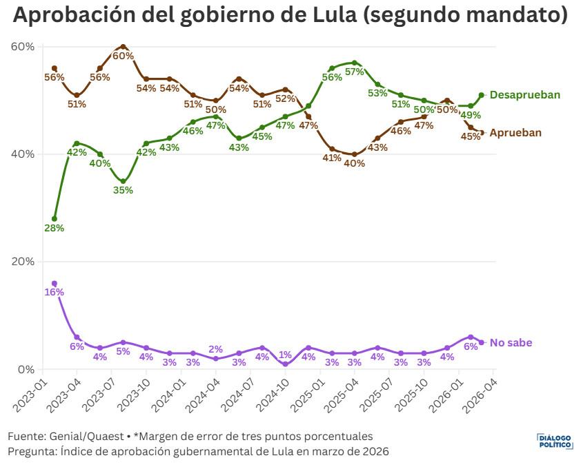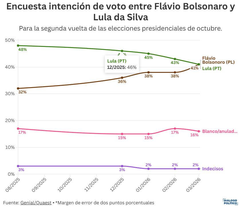 De cara a las elecciones presidenciales en Brasil el 4 de octubre de 2026, el presidente, Luiz Inácio Lula da Silva, y el senador Flávio Bolsonaro aparecen empatados con 41% en un sondeo divulgado por Quaest y Genial Investimentos.