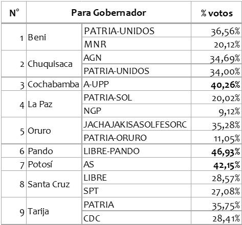 En primera vuelta sólo fueron elegidos los Gobernadores de los departamentos de Cochabamba (aunque el viernes en la tarde aún estaba el recuento en 96,11 %, la diferencia de A-UPP con su siguiente era de más de diez puntos, lo que lo constituía ganador legal), Pando (LIBRE-PANDO) y Potosí (AS, resucitando luego de cerca de dos décadas), siendo estos tres los únicos en los cuales el Gobernador elegido podrá contar con una mayoría posible de Asambleístas Departamentales (como éstos se eligen en primera vuelta, en el resto de los departamentos las alícuotas de los que van a segunda vuelta rondan entre un máximo del 36,56 % en Beni para PATRIA-UNIDOS y un mínimo del 9,12 % de NGP en La Paz). Para los otros seis departamentos, la primera vuelta dejaba cinco opciones posibles para PATRIA (Beni, Chuquisaca, La Paz, Oruro y Tarija) y dos espacios para LIBRE (Pando ya asegurado y posible Santa Cruz); pero la confrontación más cerrada quedaba en Santa Cruz con 1,49 % de diferencia entre LIBRE y SPT al 89,34 % de avance de actas computadas. (La confrontación en Santa Cruz es un fenómeno político interesante: dos candidatos ubicados ambos en sectores de derecha-centroderecha, uno joven y nuevo en política —recién surgido en las nacionales de 2025 como segundo de lista— y otro adulto mayor, habituado en ellas y que lleva al partido que siempre militó —la Falange Socialista Boliviana, mezcla de falangismo español, antimarxismo, nacionalismo y un poco de Doctrina Social de la Iglesia— a su mejores resultados y primera posible victoria desde su fundación por Unzuaga de la Vega en 1937).