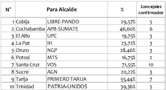 Otro caso son las Alcaldías, cuyos ganadores son elegidos en primera vuelta, y cuyo espacio de victoria va desde el 71,55 % de Manuel Saavedra con VOS en Santa Cruz de la Sierra (superior a cualquier otra elección en Bolivia, incluidas las votaciones por el legendario Percy Fernández) hasta el pírrico el 16,75 % de MTS en Potosí, aunque en miembros de los Concejos Municipales a varios los beneficia la distribución d’Hondt que emplea el sistema electoral boliviano; así aseguraron su gobernabilidad VOS que tiene 10 concejales de 11 posibles (una mayoría más que absoluta que le permitirá desarrollar su programa y promesas), PRIMERO TARIJA con siete y APB-SÚMATE (Cochabamba) con seis, quedando por debajo de esas cifras LIBRE-PANDO y PATRIA-UNIDOS (éste en Tarija), ambos con cinco concejales, mientras que en El Alto, La Paz, Oruro y Sucre los Alcaldes electos sólo serán acompañados por tres concejales (UPC, IH, NGP y AGN, respectivamente); menos gobernable aun queda la ciudad de Potosí en la que el ganador, MTS, sólo obtuvo dos concejales.