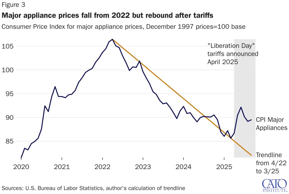 Si bien las tendencias a largo plazo en la asequibilidad de los productos acabados son favorables para los consumidores, hay un factor reciente que empuja en la dirección opuesta: los aranceles. Por ejemplo, un artículo publicado en la revista American Economic Review mostró que los aranceles de 2018 sobre las lavadoras aumentaron los precios en aproximadamente un 12%. Y aunque el Gráfico 2 anterior mostraba una mayor asequibilidad de los precios de los electrodomésticos, si nos centramos en los últimos años, las tendencias han comenzado a cambiar de nuevo en la dirección equivocada tras la imposición de aranceles mucho más amplios en 2025. el Gráfico 3 muestra que, tras subir al mismo ritmo que casi todo lo demás durante la pandemia, los precios de los electrodomésticos comenzaron a bajar en 2022 y siguieron bajando hasta 2024, pero luego se invirtió la tendencia en 2025. Si bien el aumento desde marzo de 2025 (antes de los anuncios de los aranceles más importantes) ha sido algo pequeño, habría sido mucho mayor si hubiéramos esperado que continuara la tendencia anterior a 2025.